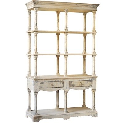 #88634 Features: -Material: solid birch wood.-4 Shelf storage with two drawers.-Wooden knobs on drawers. Color/Finish: -Distressed white finish gray accents.