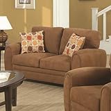 | ✚✚✚ Coaster Sibley Love Seat in Dark Tan Twill Add this love seat as another seating option in your living or family room. The track slightly curved arms hold in the boxed seat cushions along with the plush back pillows, providing you and your guests amazing comfort. Wood tapered feet complement the design while creating a contrast between the floor and the sofa. Two square pillows come with the sofa in a contemporary circle accent pattern and allow added comfort while relaxing.Plush padded twill fabric in dark tanTwo square accented pillows with contemporary circle pattern includedTapered track arms with slightly curved top and welt cord accentSquare tapered exposed wood feetHardwood Durable Construction FrameWebbed back and spring seat construction to increase strength and durabilitySpecifications:Overall Product Dimensions: 34.5"" H x 63.5"" W x 35.5"" DWeight: 99 lbs