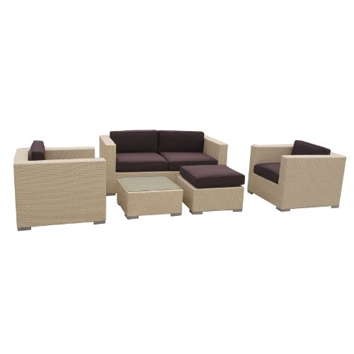 Malibu Sofa Set Tan brown Color?On the border of the Pacific Ocean lies a place of great peace and quietude. Surrounded by silence, Malibu's soft all-weather white fabric cushions and espresso rattan base take you to that place, one relaxing and conducive for interaction with others. Abstract past experiences morph into future discoveries with a warm set that helps expand your horizons. Set Includes: One - Malibu Outdoor Wicker Patio Coffee Table One - Malibu Outdoor Wicker Patio Loveseat One - Malibu Outdoor Wicker Patio Ottoman with Cushion Two - Malibu Outdoor Wicker Patio Armchairs Dimensions: