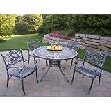 | ✚✚✚ Oakland Living Sunray Cast Aluminum 48 in. Hummingbird Patio Dining Set - Seats 4 Exuding an enduring aesthetic that will never go out of style, the Oakland Living Sunray Cast Aluminum 48 in. Hummingbird Patio Dining Set - Seats 4 makes a delightful addition to any backyard or patio. The sunburst-pattern table top creates the perfect foil for the casual charm of the chair, with its hummingbird and scroll-accented backrest. The 48-inch-diameter table sports an umbrella hole, so you can relax in the shade on hot days. Each piece is hand cast from rust-resistant cast aluminum and sports hardened powder-coat Antique Pewter finish that's fade-, chip-, and crack-resistant and retains its beauty season after season. Add the optional weather-resistant, quick-dry cushions to pump your comfort level up a few more notches.Dimensions:Dining table: 48 dia. x 29H inchesDining chair (each): 21L x 23W x 34H inches