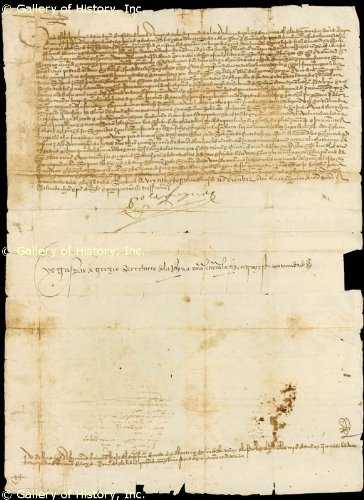 QUEEN ISABELLA I (SPAIN) - MANUSCRIPT DOCUMENT SIGNED 11/25/1501 . QUEEN ISABELLA I. Manuscript DS: "Yo la Reyna" ("I the Queen"), 1p, 11¾x16. 1501 November 25. In old Spanish, not translated. Queen Isabella I (1451-1504) and King Ferdinand V (1452-1516) jointly ruled Spain from 1479-1504). Rulers of Spain did not sign their names; they signed "I the Queen" or "I the King". Queen Isabella was convinced by Christopher Columbus to sponsor his voyages of discovery. During his third expedition, from 1498 to 1500, in which Columbus sailed farther south, to Trinidad and Venezuela, the Spanish monarchs decided to send to Haiti an officer to investigate and punish anyone who treated the Indians with inhumane customs. On August 23, 1500, a year before Queen Isabella signed this document, Columbus and his brothers were arrested in Santo Domingo and sent home in chains. Columbus's titles of Governor and Viceroy were removed by royal decree. Columbus refused to have the chains removed until the monarchs themselves issued the order to do so. He arrived in Cádiz in November 1500. Upon hearing of Columbus's plight, Queen Isabella and King Ferdinand immediately ordered the chains removed and he and his brothers freed. With his titles annulled, the former Governor spent the next two years in despair and humiliation. On May 11, 1502, less than six months after the Queen signed this document, Columbus made his fourth and last expedition to the New World. He sailed to Mexico, Honduras, Panama and Santiago and landed on the South American mainland. Queen Isabella was also a patron of scholars and artists, establishing educational institutions and building a large collection of art works. She learned Latin as an adult, was widely read, and educated not only her sons but her daughters. One of these daughters, Catherine of Aragon, was the first wife of King Henry VIII of England and mother of Queen Mary I of England. Fragile, worn. Sporadically... For more information contact HistoryForSale. DOCUMENT 262959